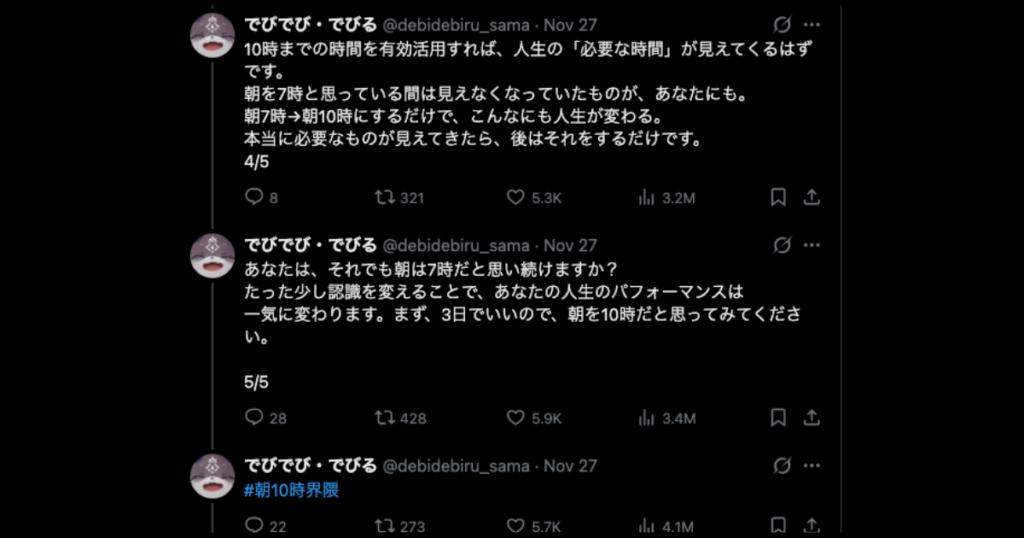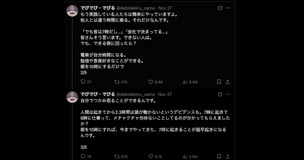 投稿された内容では、「7〜8時に通勤電車に乗るのは勿体無い」「朝10時に動き出せば朝7時起きは超早起きになる」などが記載されていました。