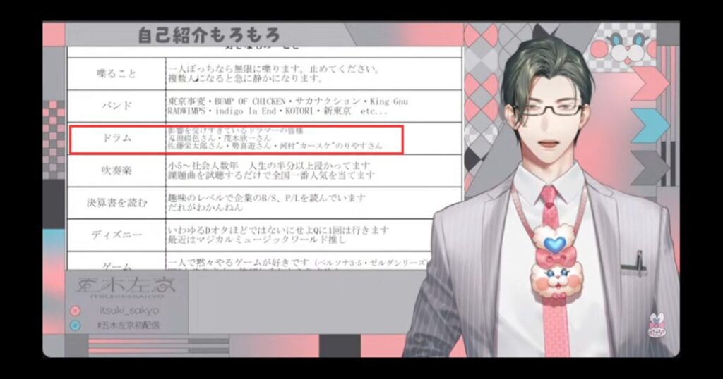 初配信の際、五木左京さんはドラムの経験者であり、吹奏楽からバンド音楽も好きであると明かしています。