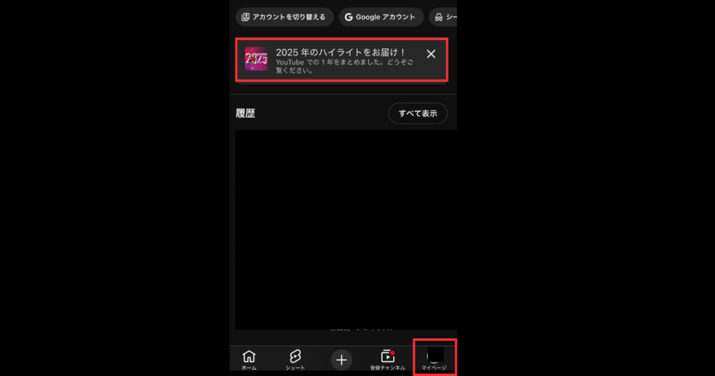 YouTubeハイライトは自身のアカウントの、マイページで確認可能です。